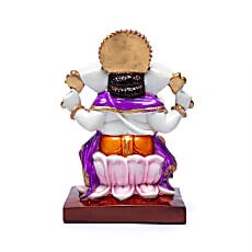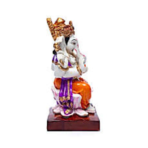 Statuette détaillée de Ganesh en résine, assis sur un trône de lotus. Dans son bras supérieur gauche, ce Ganesh tient un aiguillon (ankusha), utilisé pour éliminer les obstacles et guider la direction du dévot. Dans son bras supérieur droit, il tient un nœud coulant (pacha), qui symbolise le pouvoir de contrôler ses désirs. La main inférieure droite est dans l'abhaya mudra, un geste de protection et de bénédiction, indiquant le réconfort et la suppression de la peur, tandis que dans la main gauche, elle tient un modaka - un dessert sucré traditionnel - qui symbolise les récompenses d'une vie disciplinée et dévouée. .