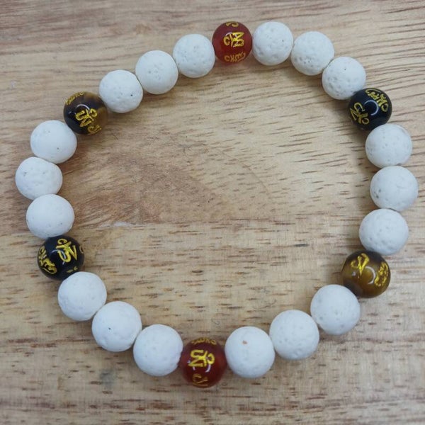 Bracelet en pierre de lave blanche - gravé mantra Om 8 mm