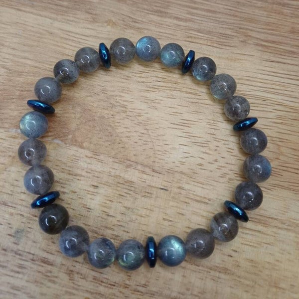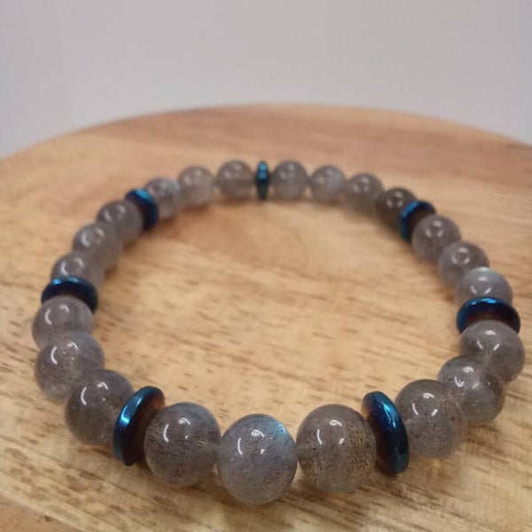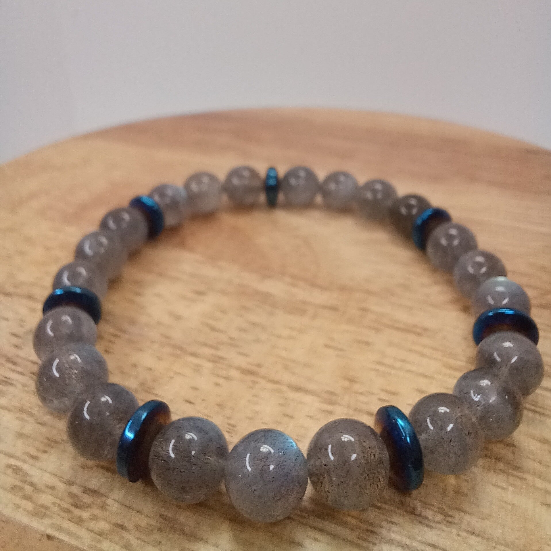 Ce bracelet est un véritable gardien énergétique, né de l'union entre la lumière irisée de la labradorite et la force tellurique de l'hématite. Il agit comme un pont entre les mondes subtils et la stabilité de la Terre.