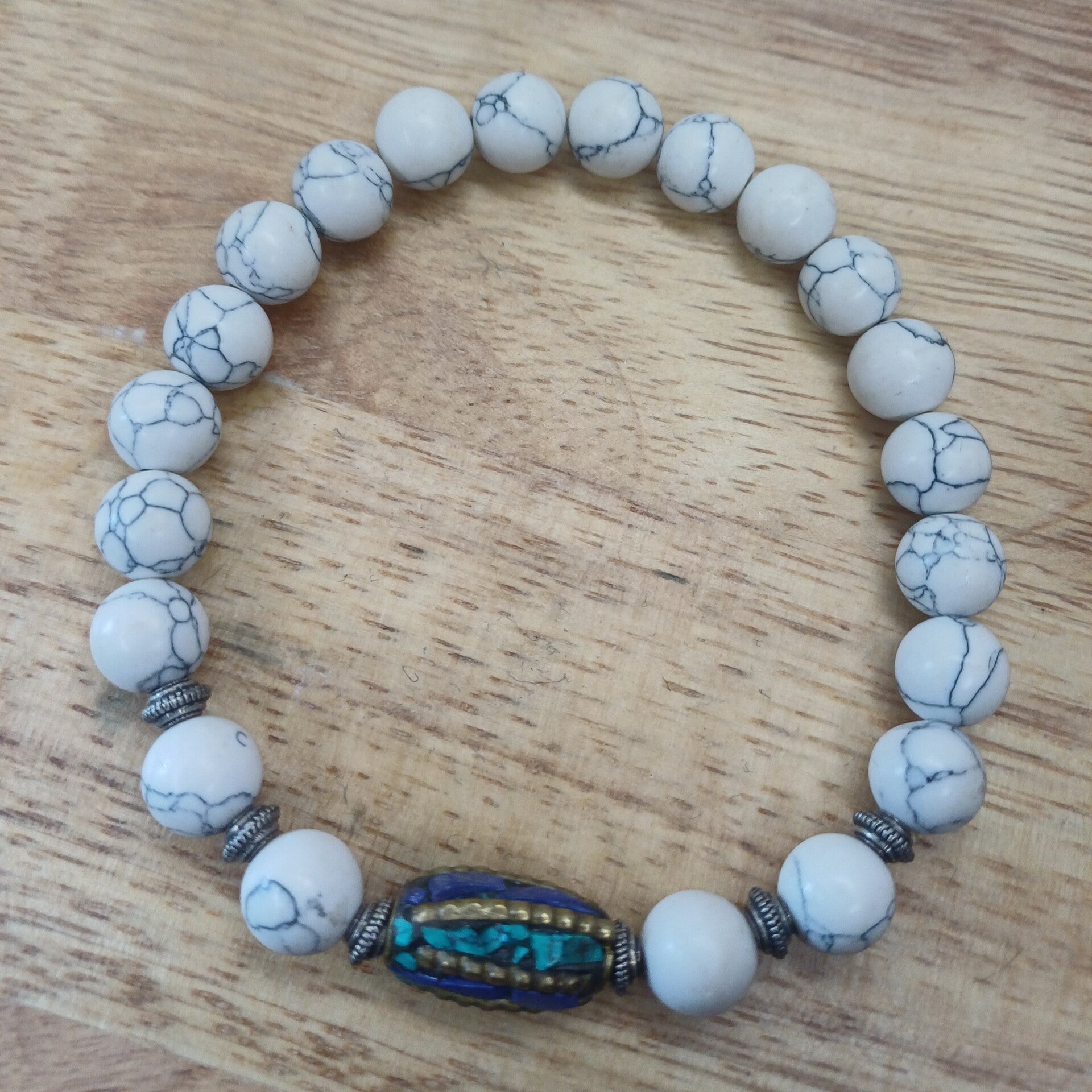 Blanc comme la lumière lunaire, ce bracelet allie la douceur apaisante de la howlite à la sagesse artisanale des perles népalaises. Chaque pierre est choisie avec soin, pour sa beauté naturelle et son énergie subtile, créant un bijou unique, à la fois élégant et chargé de sens.