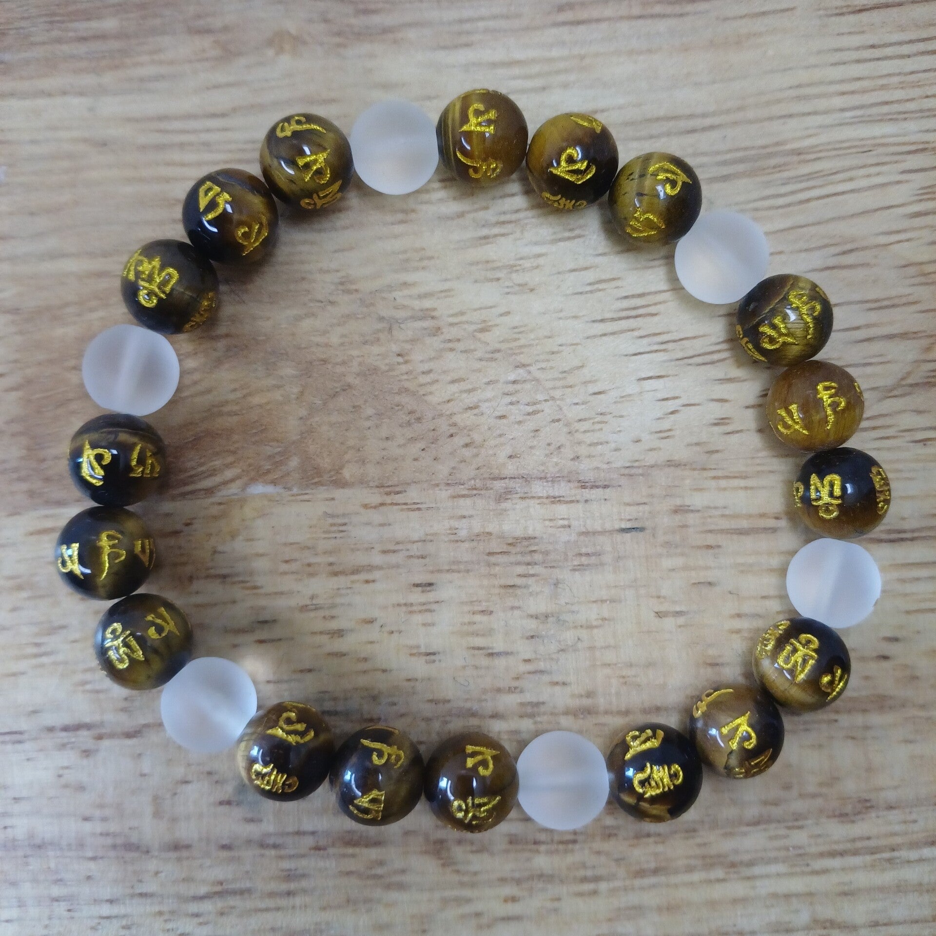 Bracelet Œil du tigre - gravé mantra Om & cristal de roche 8 mm