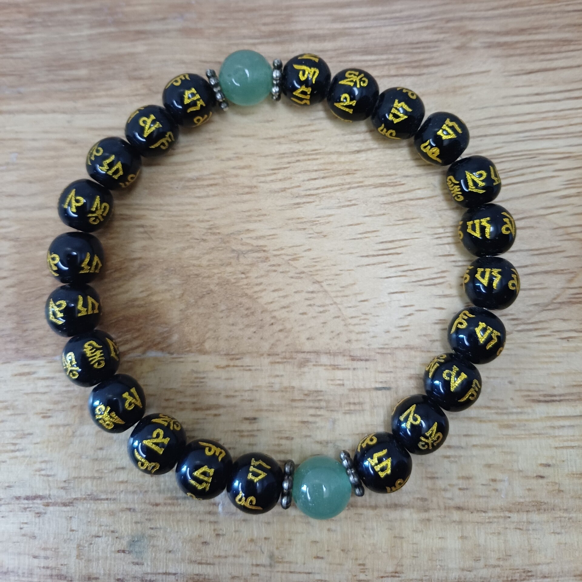 Bracelet Obsidienne noire - gravé mantra Om & Aventurine 8 mm