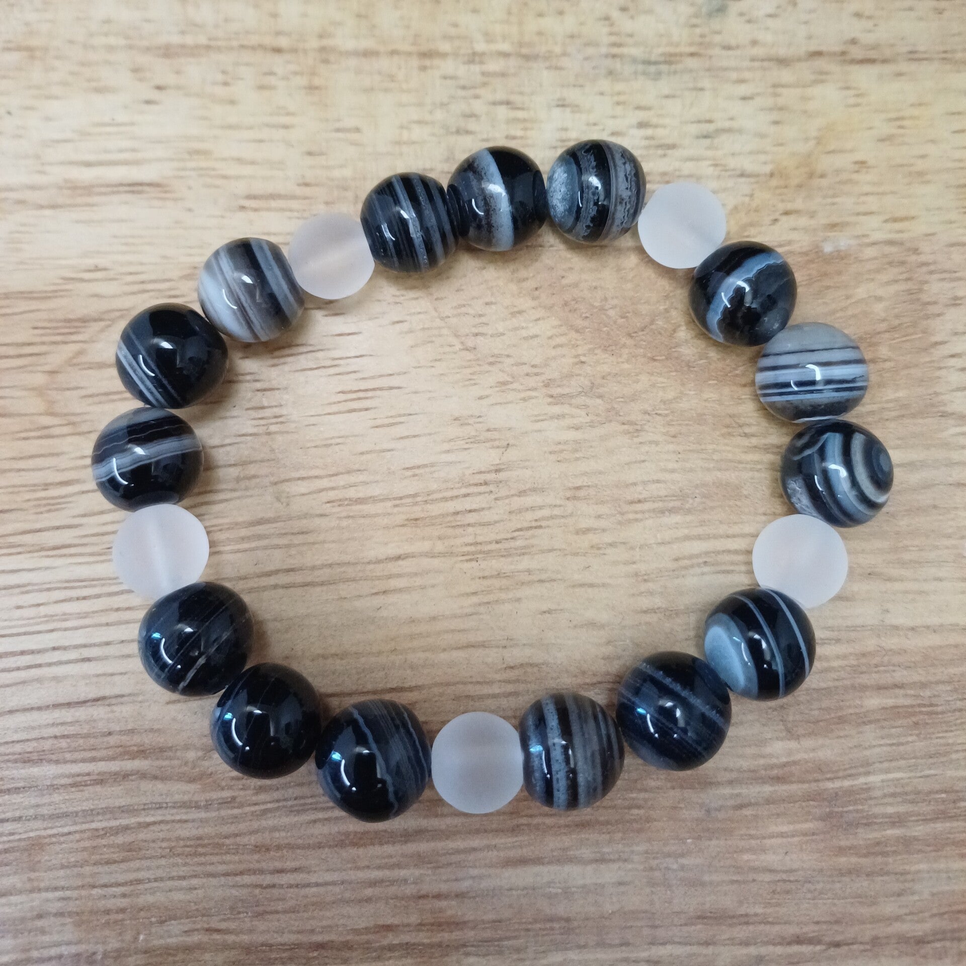 Bracelet Sardonyx noire et blanche & Cristal de roche mat 10 mmm