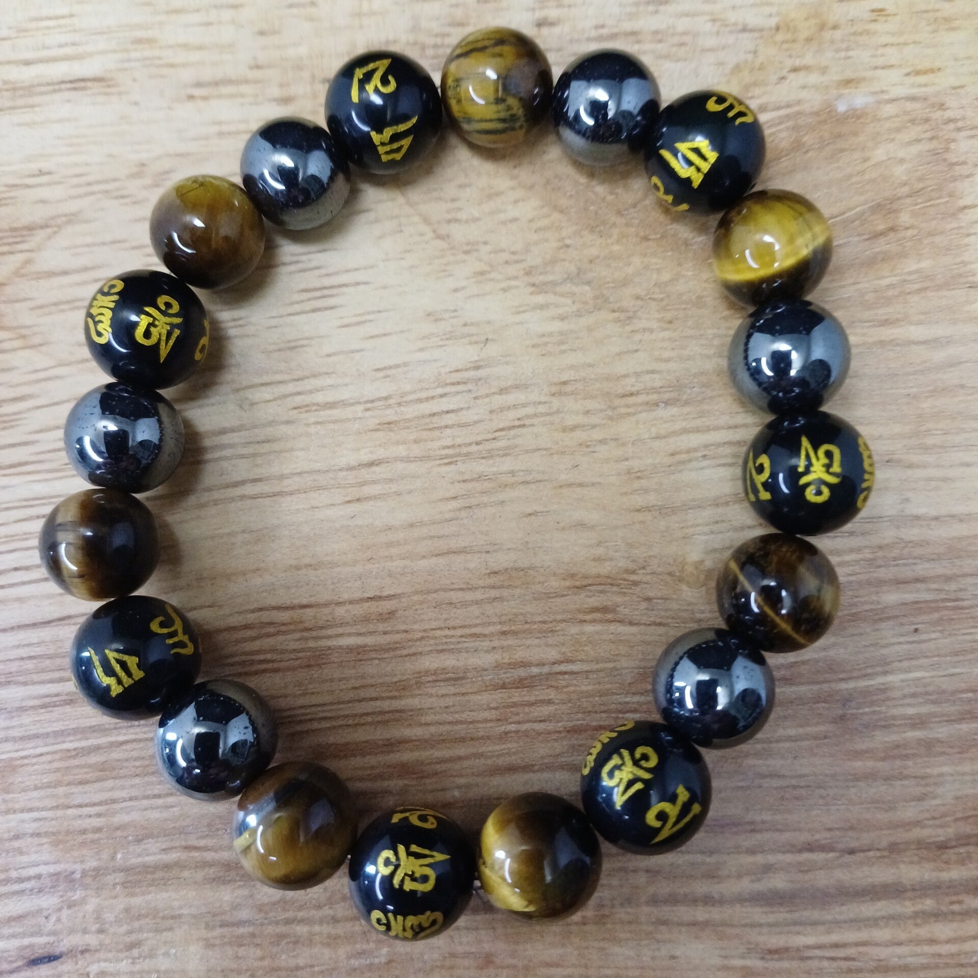 Bracelet Œil du Tigre / Hématite / Obsidienne Œil Céleste gravée mantra Om 10 mm