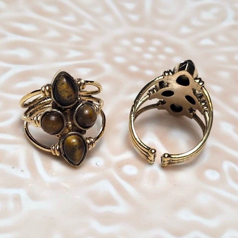 La bague Elizabeth dorée, ornée de quatre pierres d’Œil de Tigre, est bien plus qu’un simple bijou : c’est un véritable talisman de protection et d’ancrage.